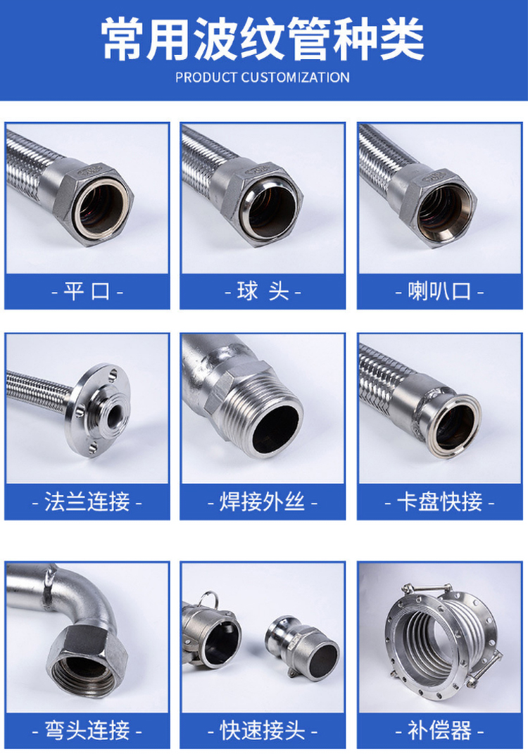 金屬波紋管是一種外型象規(guī)則的波浪樣的管材,常用的金屬波紋管有碳鋼的,和不銹鋼的,也有鋼質(zhì)襯塑的、鋁質(zhì)的等等。主要用于需要很小的彎曲半徑非同心軸向傳動,或者不規(guī)則轉(zhuǎn)彎、伸縮,或者吸收管道的熱變形等,或者不便于用固定彎頭安裝的場合做管道與管道的連接,或者管道與設(shè)備的連接使用。